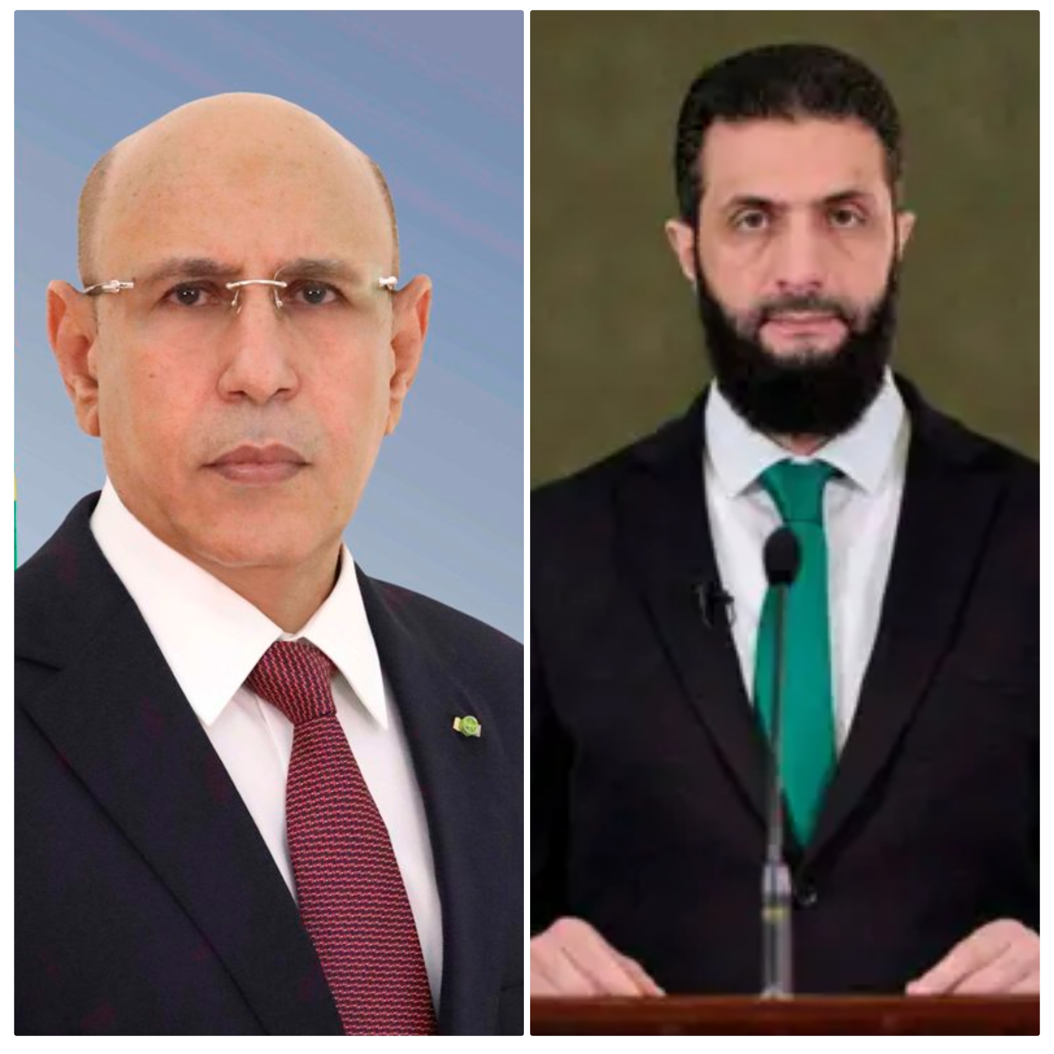 يطيب لي، بمناسبة توليكم مهام رئاسة الجمهورية العربية السورية خلال المرحلة الانتقالية، أن أتقدم إلى فخامتكم، باسم الجمهورية الإسلامية الموريتانية شعبًا وحكومةً، وباسمي شخصيًا، بأحر التهاني وأصدق التمنيات.
