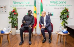 وقد حضر إلى جانب فخامة رئيس الجمهورية ونظيره السنغالي خلال هذا الاحتفال، كبار المسؤولين في شركتي بريتيش بتروليوم BP وكوسموس إنيرجي العالميتين، من ضمنهم السيد ميراي أو شيكلوس الرئيس التنفيذي للشركة.