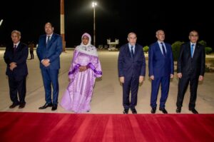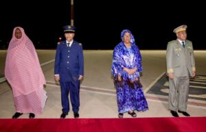 واستقبل فخامة رئيس الجمهورية لدى وصوله مطار نواكشوط الدولي أم التونسي من طرف معالي الوزير الأول السيد المختار ولد أجاي، ومعالي الوزير الأمين العام لرئاسة الجمهورية السيد مولاي ولد محمد لغظف، ومعالي الوزيرين المستشارين برئاسة الجمهورية السيد محمد ولد عبد الله ولد عثمان، والسيدة عيشاتا با يحيى، ومعالي وزير العدل السيد محمد محمود ولد الشيخ عبدالله بن بيه، ومعالي وزير الدفاع وشؤون المتقاعدين وأولاد الشهداء السيد حنن ولد سيدي، ومعالي وزير الداخلية وترقية اللامركزية والتنمية المحلية السيد محمد احمد ولد محمد الأمين، وقائد الأركان الخاصة لرئيس الجمهورية الفريق ابراهيم فال الشيباني الشيخ أحمد، والمديرة المساعدة لديوان رئيس الجمهورية السيدة غانديغا فاتيماتا،
