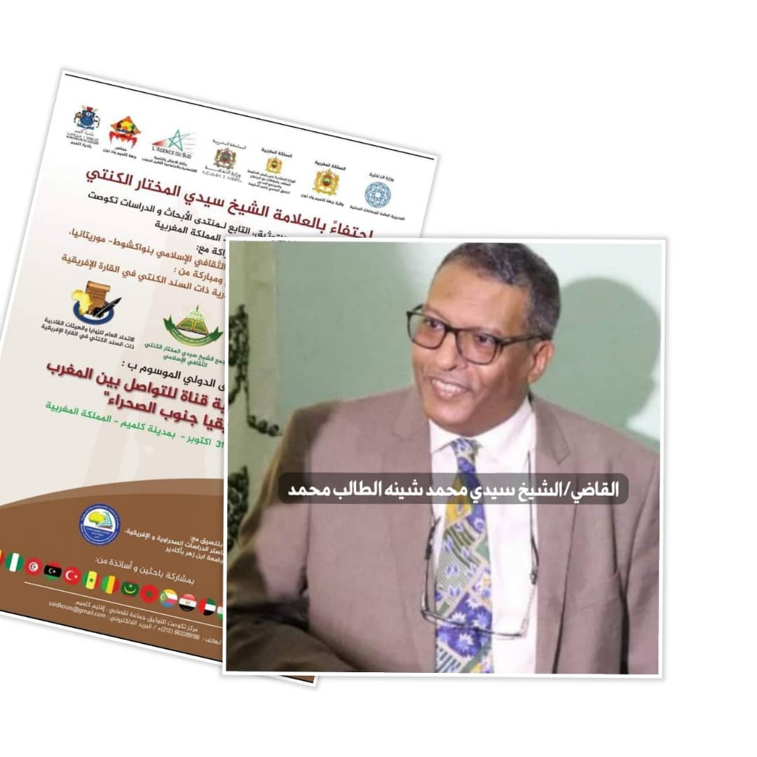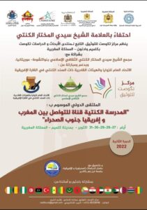 الاستعدادات جارية لانطلاق دورة الشيخ سيدي المختار الكنتي في إطار النسخة الثانية من الملتقى الدولي الموسوم ب المدرسة الكنتية قناة للتواصل بين المغرب وافريقيا جنوب الصحراء المنظم- إن شاء الله – في مدينة كلميم ايام 27 28 29 30 31 أكتوبر 2022 من طرف مركز تكوست للتوثيق برئاسة الدكتور سعيد كويس ومجمع الشيخ سيدي المختار الكنتي الثقافي الاسلامي في موريتانيا برئاسة الأستاذ أحمد بن باب أحمد بن حم الأمين.