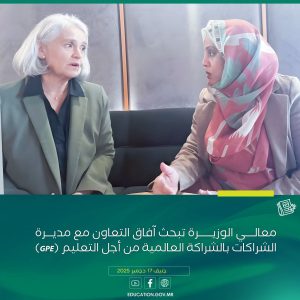 وخلال هذا اللقاء، عبّرت معالي الوزيرة عن شكرها وتقديرها للشراكة العالمية من أجل التعليم على تمديد فترة التمويلات القائمة، وعلى مصادقة مجلس إدارة الشراكة على تمويل جديد بقيمة 17.53 مليون دولار أمريكي، دعمًا لجهود موريتانيا في تحسين جودة التعليم وتعزيز نتائج التعلّم.