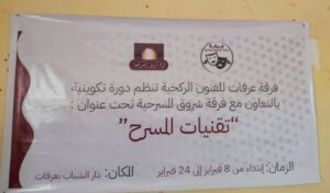 ويشارك في هذه الدورة مايقارب 15 من الشباب بين الإناث والذكور، وسيتلقى المشاركون دروسا نظرية واخرى تطبيقة حول “تقنيات المسرح”.
