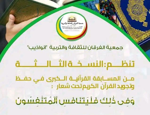 قامت جمعية الفرقان للثقافة والتربية بإطلاق النسخة الثالثة من المسابقة الكبرى لحفظ القرآن الكريم بمدينة نواذيبو شمال موريتانيا .