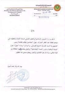 “تدعو وزارة الشؤون الإسلامية والتعليم الأصلي السادة الأئمة والخطباء إلى توحيد خطبة عيد الفطر المبارك ، حول “مضامين خطاب فخامة رئيس الجمهورية السيد/ محمد ولد الشيخ الغزواني، بــ”وادان” ونداء “جول” حول الوحدة الوطنية وتعزيز اللحمة الإجتماعية” والعمل بمضامينهما انطلاقا من قوله تعالي: (ولا تنازعوا فتفشلوا وتذهب ريحكم) صدق الله العظيم.”